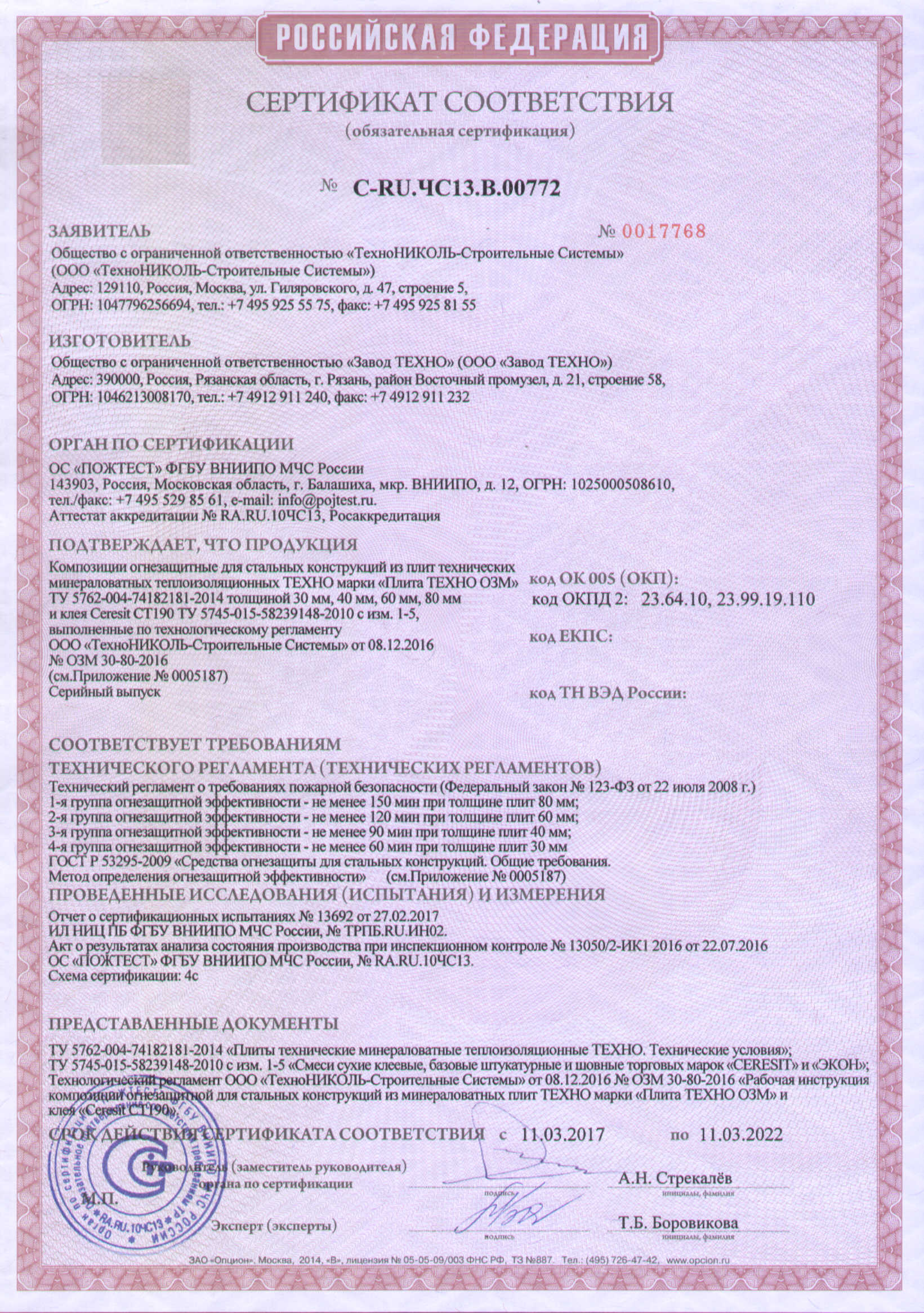 • сертификаты соответствия ГОСТ и пожарной безопасности.